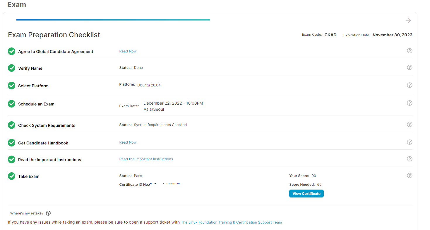 CKAD도 취득했습니다. 원래 CKS를 먼저 따려고 했는데, 1회차 탈락의 고비가 있어서 ㅠㅠ