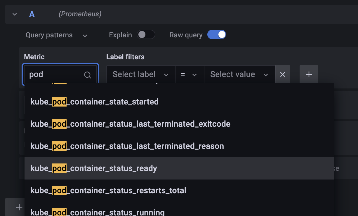위의 예제처럼 pod_container_status_ready를 그라파나에 등록해보겠습니다.