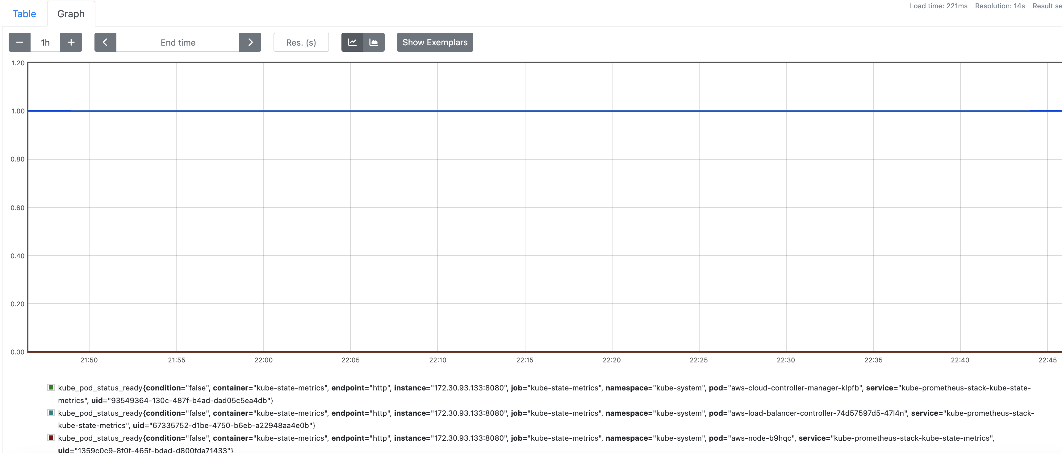 이처럼 pod의 ready 상태만 조회해봐도 이렇게 자세한 내용이 표시되며, 그래프도 그릴 수 있습니다.