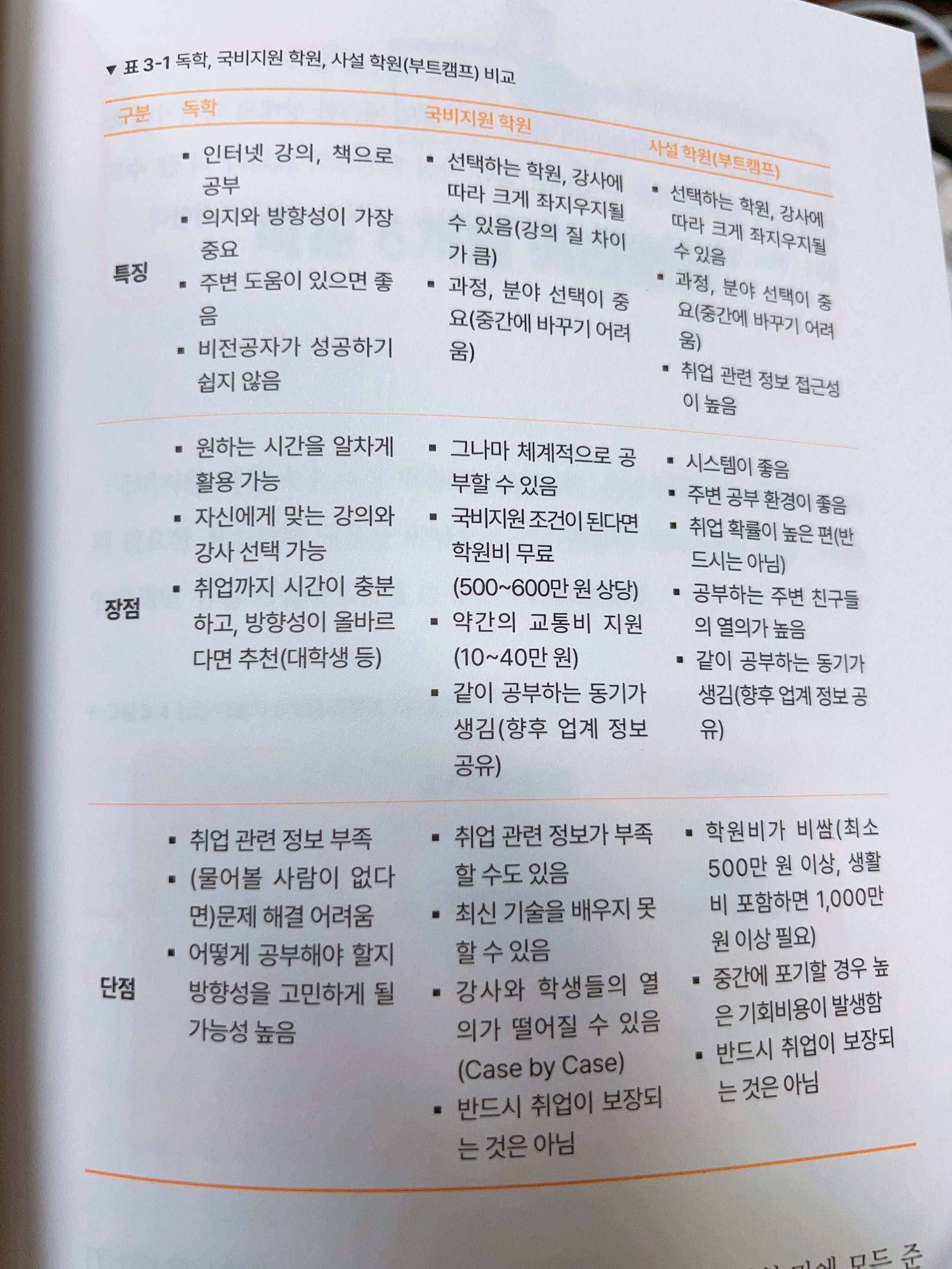 책에서 추천하는 방식은 부트캠프 > 국비지원 > 독학 순이다.