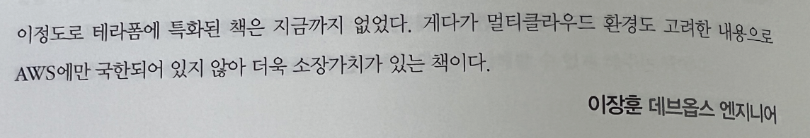 그리고 테라폼만 전문적으로 출간한 책은 <<Terraform up and running>> 정도가 유명한데 벌써 3판까지 나왔으나 아직 번역서가 출간되지 않아서 영어로만 읽을 수 있다. 번역된 2판은 이미 오래전에 나와서 변화된 내용도 많다. 따라서 가장 따끈따끈한 지식을 한국 저자가 쓴 내용으로 읽을 수 있기 때문에 이것만으로도 엄청 강점이라고 할 수 있다.