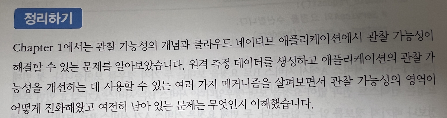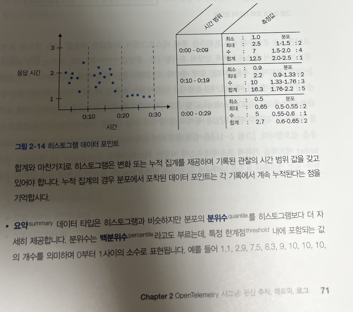 관찰 가능성이 지금까지 어떻게 발전했는지 다룬다. 개방형 표준의 필요성을 목적으로 오픈소스로 개발되는 과정을 확인할 수 있다. OpenTelemetry의 주요 개념은 시그널, 리소스, 파이프라인, 컨텍스트 전파로 나눠져 있고 이에 대해서 챕터별로 다루고 있다.