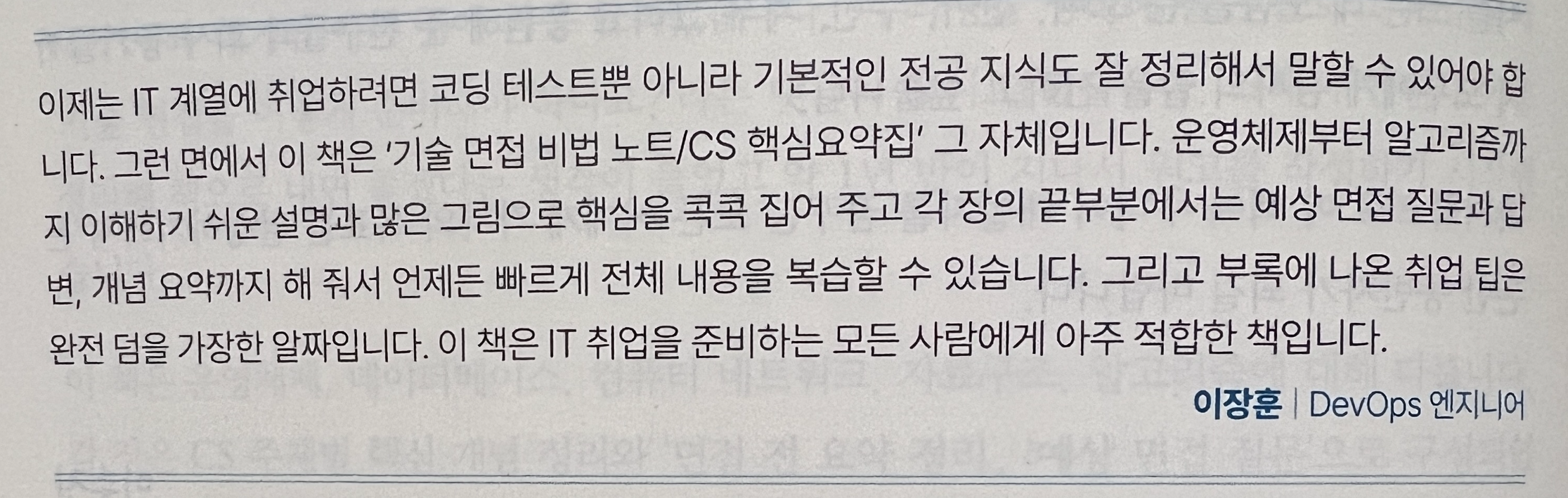 만약 당신이 처음 CS를 공부하는 사람이라면, 이 책의 난이도와 면접 예상 질문을 통해서 내가 배워야하고 시간을 투자해야하는 것이 명확하게 무엇인지 길잡이 역할을 해줄 것이다. 이 책은 자질 구래한 것들은 모두 뺐기 때문에, 오히려 방대한 CS책 보다 이 책이 명확한 로드맵이 될 수 있다.