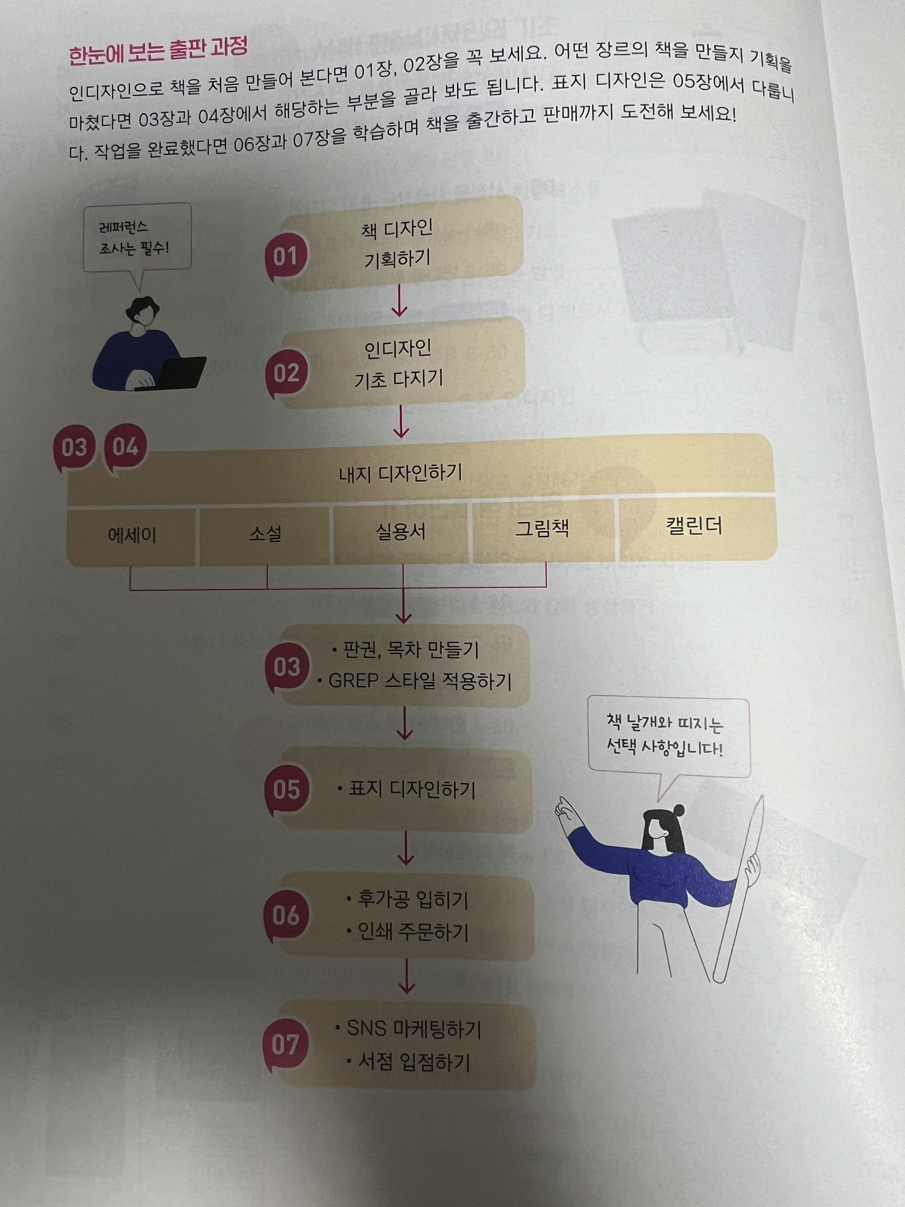 아무래도 단편적으로 표지만 만드는 책, 출간에 대한 개략적인 책들은 많아도 이렇게 처음부터 끝까지 수록되어 있는 책은 많이 없는 것 같다. 책의 분량도 엄청 부담되는 크기가 아닌데 전부 다 있어서 덕분에 실제로 해보는 것도 크게 부담가지지 않을 수 있었다.