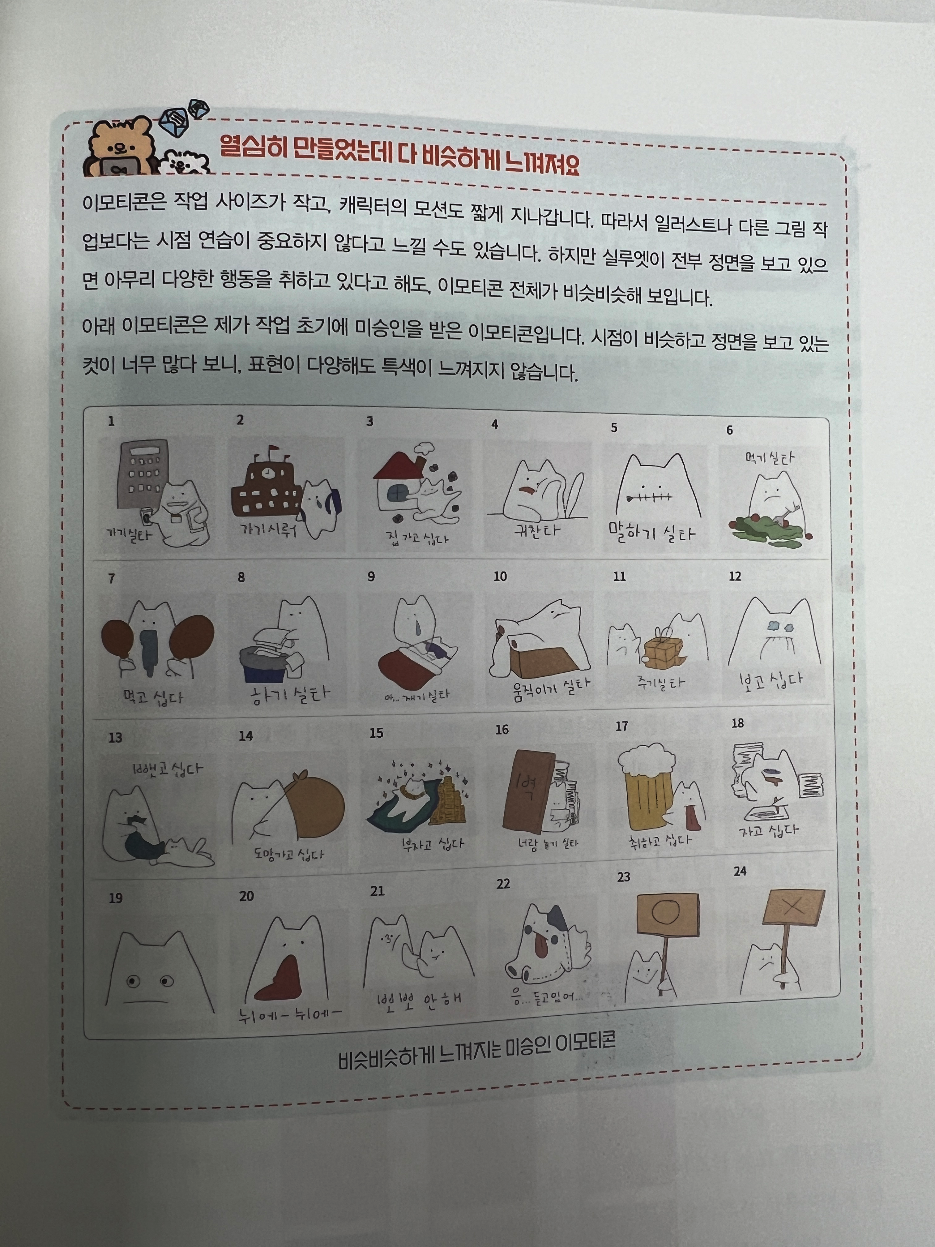 실제로 내가 이모티콘을 만들려면 뭘해야하지? 막막한 경우가 많은데 책 대로 따라하면 자연스럽게 터득하게 됩니다.