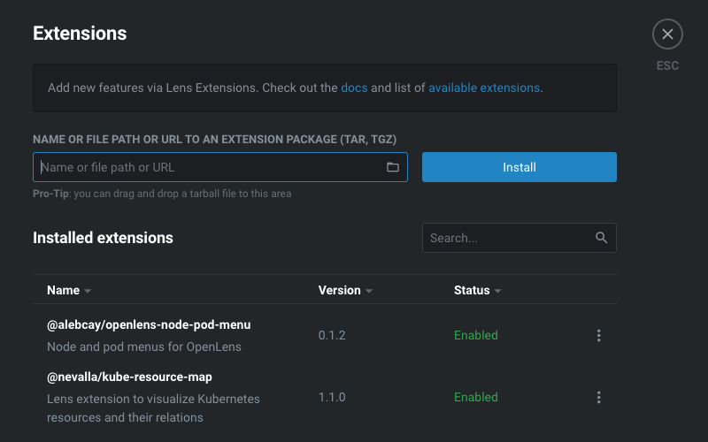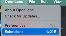 기존 lens와 동일하게 extention을 사용할 수 있는데, OpenLens > Extensions 메뉴에 들어가면된다.