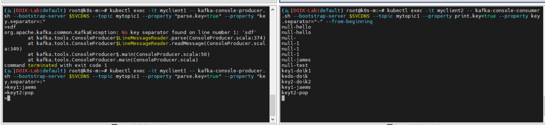 kubectl exec -it myclient1 -- kafka-console-producer.sh --bootstrap-server $SVCDNS --topic mytopic1 --property "parse.key=true" --property "key.separator=:"