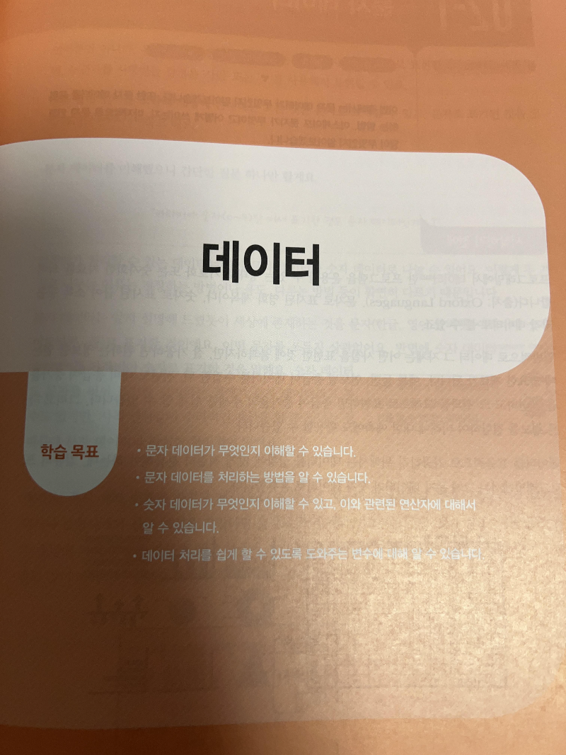 2장 데이터에서는 실제 프로그래밍을 시작합니다. 문자데이터와 숫자데이터를 어떻게 선언하고 사용하고 활용하는지 배웁니다. 숫자데이터의 경우 연산자나 우선순위 등 관련내용을 학습하고 변수의 네이밍 규칙을 알아봅니다.