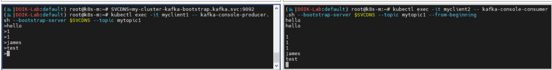kubectl exec -it myclient2 -- kafka-console-consumer.sh --bootstrap-server $SVCDNS --topic mytopic1 --from-beginning