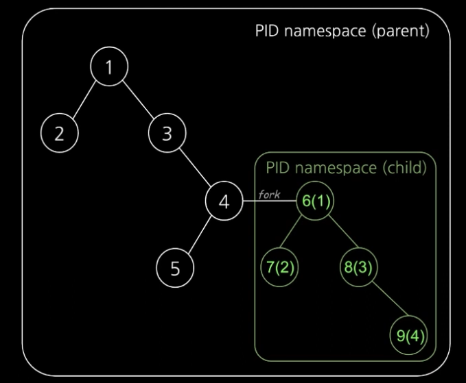 PID(Process ID)의 특징은 부모-자식 네임스페이스의 중첩구조이다. 부모 네임스페이스는 자식네임스페이스의 pid를 확인할 수 있고, 자식 네임스페이스는 부모의 pid와 자신의 pid 즉 2개의 pid 값을 가진다.