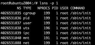 lsns(list namespace)를 통해서 pid 값에 따라 네임스페이스를 확인할 수 있다.