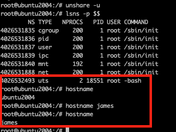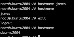처음 hostname을 찍으면 호스트 정보를 그대로 가지고 있어서 기존 호스트 이름이 나오지만 hostname 명령으로 호스트명을 바꿀 수 있다. 당연히 이것은 지금 격리된 네임스페이스에서 되는 정보이므로 exit하게되면 격리를 벗어나기때문에 사라진다.