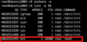 피봇 루트를 하기 위한 최초의 네임스페이스이다. 실제로 실행해보면 다음과 같고 lsns를 통해서 격리여부를 확인할 수 있다.