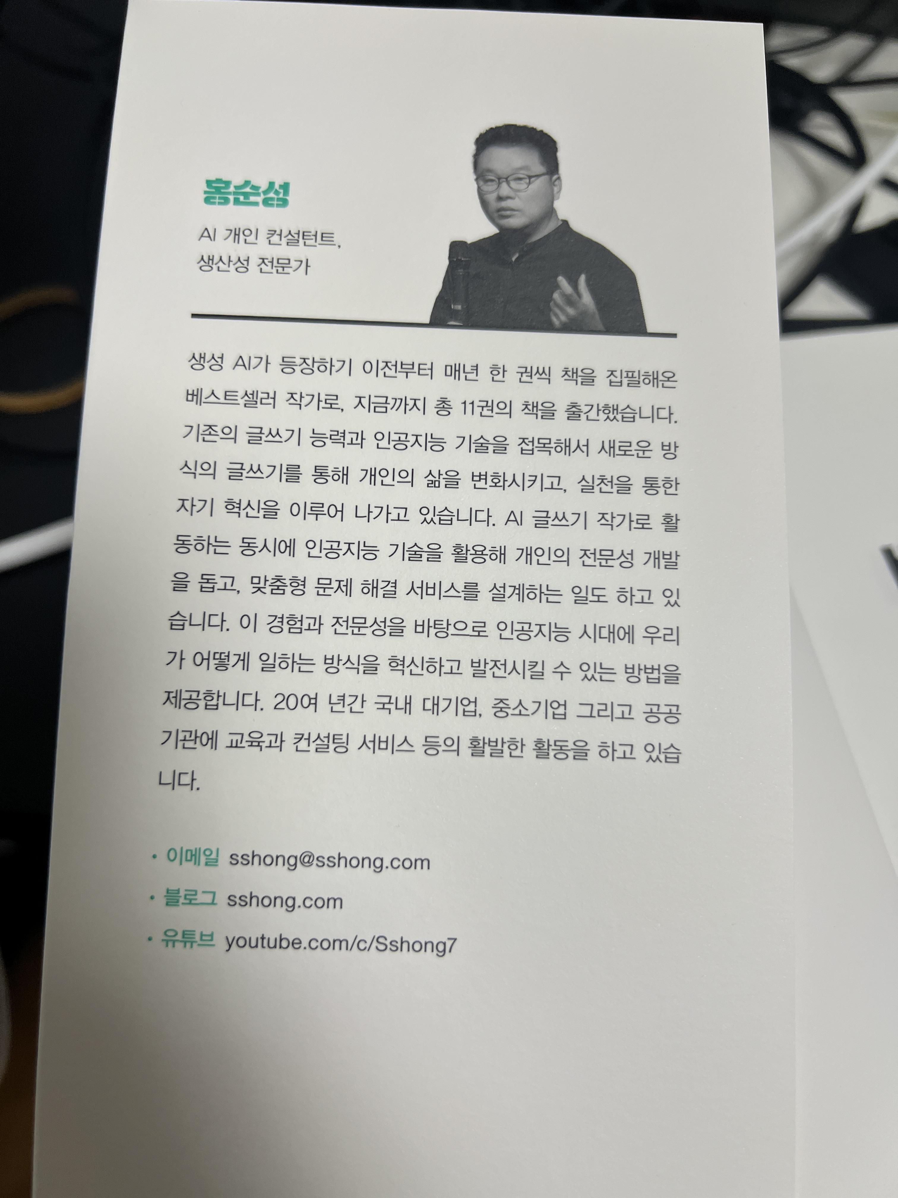 지은이 홍순성님은 AI 개인 컨설턴트도 하시고 나름 AI에 대해서 공부도 많이하시고 강의도 하시는 것 같습니다. 책까지 내셨네요.