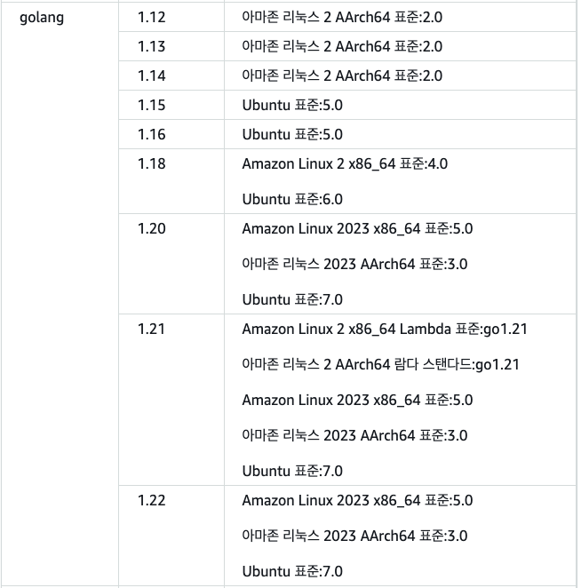 예를 들어 golang:1.12 버전을 사용하고 싶으면 amazon linux 2 AArch64 표준 2.0 이미지를 사용해야합니다.