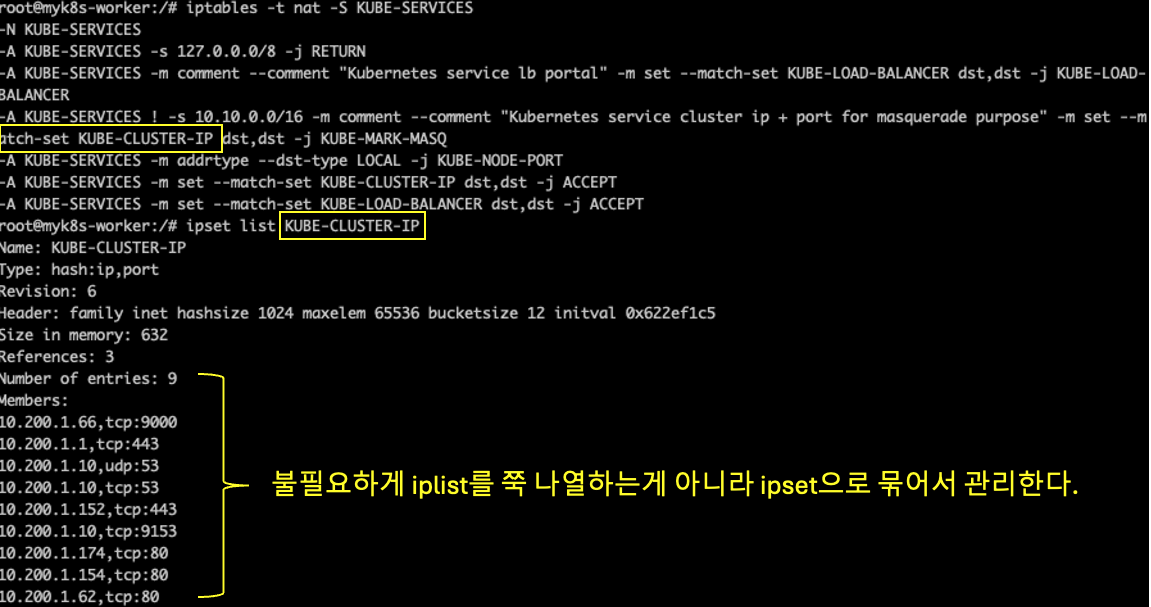 IPVS 모드에서는 불필요하게 IP마다 룰을 나열하는게 아니라 ipset에서 리스트화 하여 관리한다. 그래서 테이블에서는 ipset 이름으로 보내도록 설정되어 있고, 실제 ipset의 list를 조회하면 해당하는 IP목록을 확인할 수 있는 방식이다.