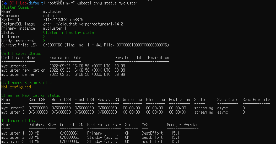 mycluster-6 42 MB 0/15013158 Standby (async) OK BestEffort 1.15.1