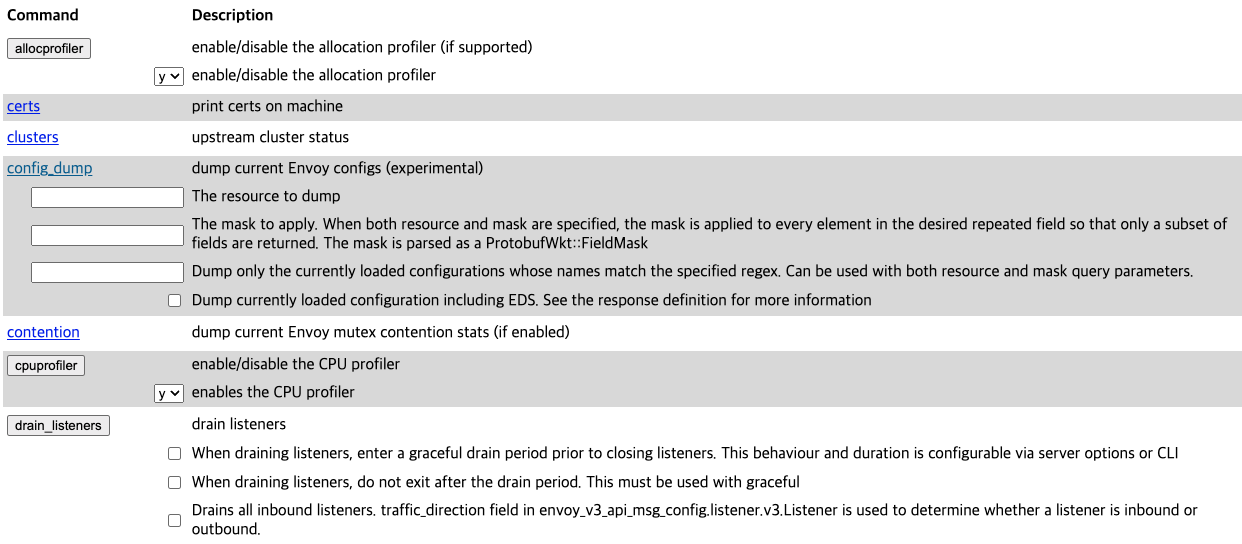 다음은 envoy에서 제공하는 관리자 인터페이스에 대한 조작이다.