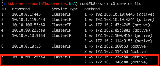 cilium-agent에서도 service list를 확인해보면 서비스에서 연결되어 있는 pod의 목록을 손쉽게 확인할 수 있다.