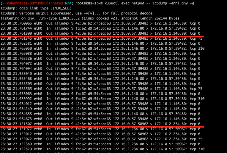그리고 netpod에 가서 tcpdump를 실행해보자. 지금 나의 서비스 IP는 10.10.60.189인데, 해당 IP는 아무리 봐도 tcpdump에 기록되지 않는다. 바로 172.16.0.57(netpod)에서 172.16.1.146(webpod2), 172.16.2.234(webpod1)으로 바로 tcp가 향하는 것을 볼 수 있다.