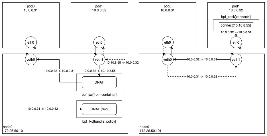 위 그림을 보면 불필요하게 DNAT를 다녀올 필요없이(왼쪽) pod 자체에서 아이피를 변경해서 바로 목적지로 향한다.(오른쪽)