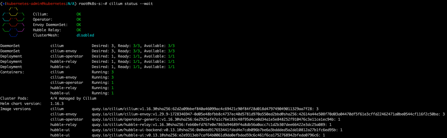 운영되는 각 cilium의 상태를 보려면 해당 컨테이너에 들어가서 status 명령어를 통해서 모듈의 상태까지도 체크할 수 있다.