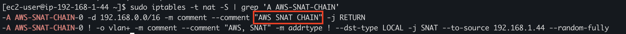 sudo iptables -t nat -S | grep 'A AWS-SNAT-CHAIN'