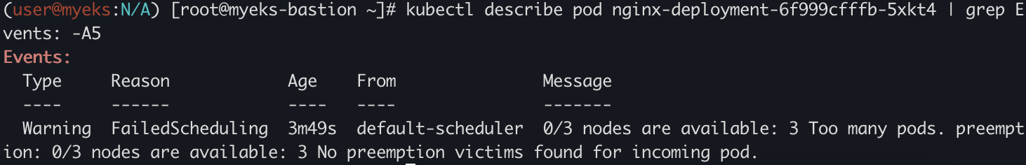 too many pods 오류가 발생하는 것을 확인할 수 있다.