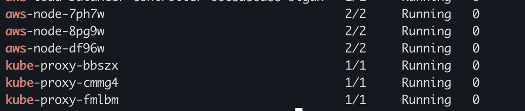 기본적으로 EKS를 배포하면 kube-system 네임스페이스에서 aws-node와 kube-proxy를 확인할 수 있다. 이 둘은 CNI를 구성하고 네트워킹을 설정하는 중요한 파드로 역할을 한다.
