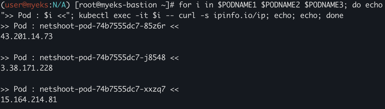 for i in $PODNAME1 $PODNAME2 $PODNAME3; do echo ">> Pod : $i <<"; kubectl exec -it $i -- curl -s ipinfo.io/ip; echo; echo; done