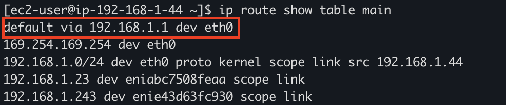 라우트 테이블을 node 1에서 확인해보면 디폴트 네트워크는 eth0 을 통해서 빠져나간다는 것을 확인할 수 있다.
