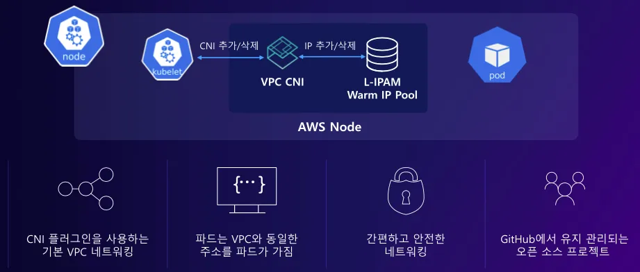 aws-node라는 파드가 기본적으로 배포되는데 다음과 같은 역할을 한다.