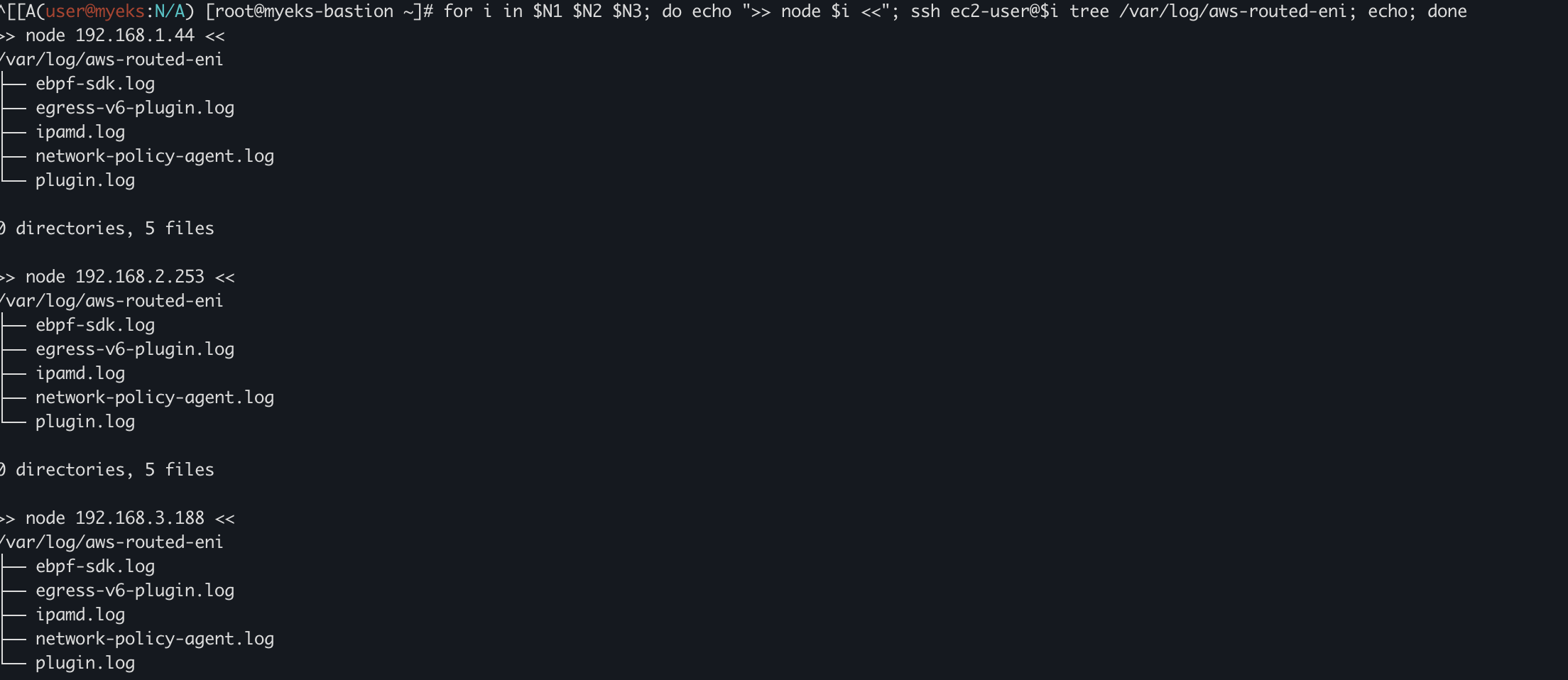 for i in $N1 $N2 $N3; do echo ">> node $i <<"; ssh ec2-user@$i tree /var/log/aws-routed-eni; echo; done
