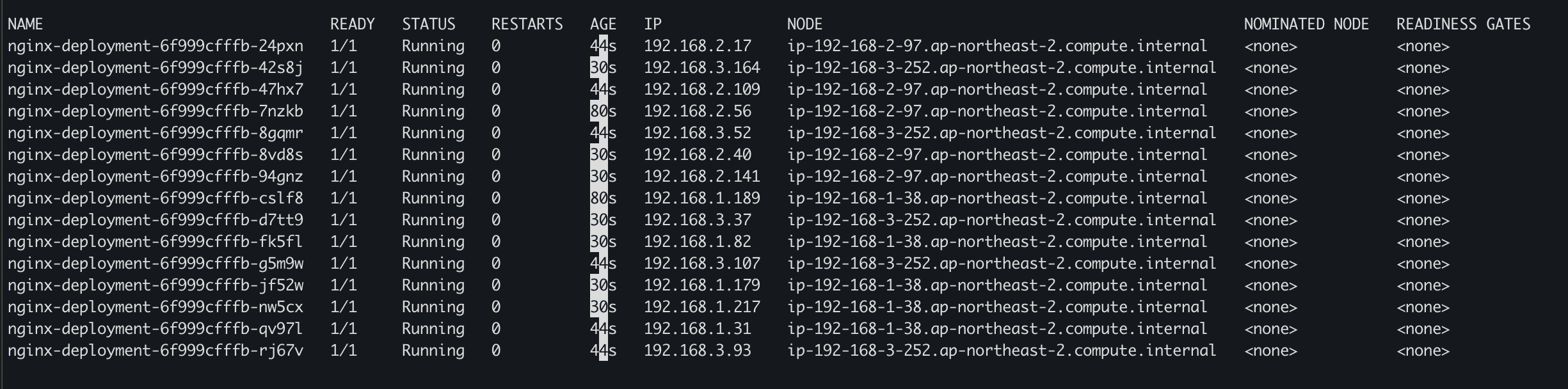 테스트에서는 t3.medium 노드가 3개이기 때문에 총 45개의 IP를 가져갈 수 있어 pod의 갯수를 매우 늘려보겠다.