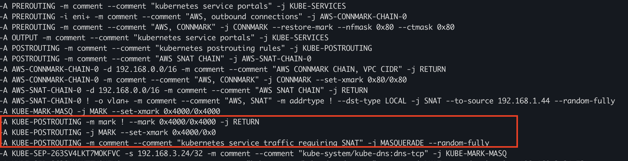 sudo iptables -t nat -S | grep 'A AWS-SNAT-CHAIN'