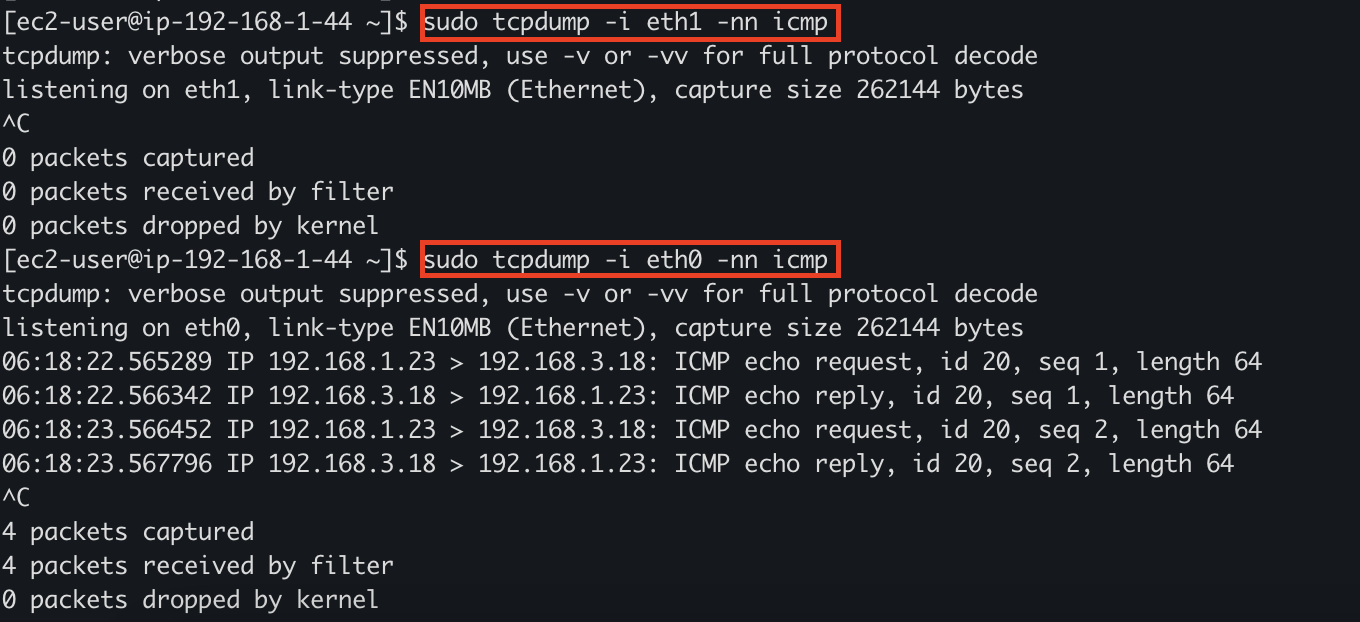 실제로 eth1과 eth0을 tcpdump 해보게 되면 eth1은 트래픽이 없고, eth0에서 트래픽이 발생하는 것을 확인할 수 있다.