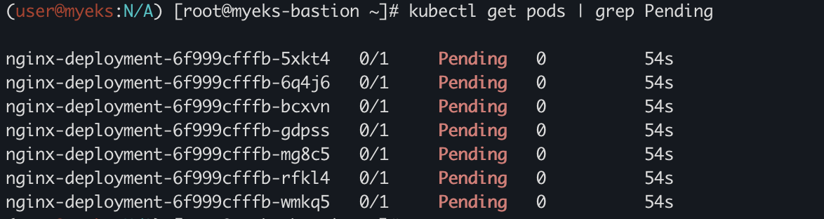 갯수를 50개로 늘리니까 7개의 pod가 pending 상태임을 확인할 수 있다.