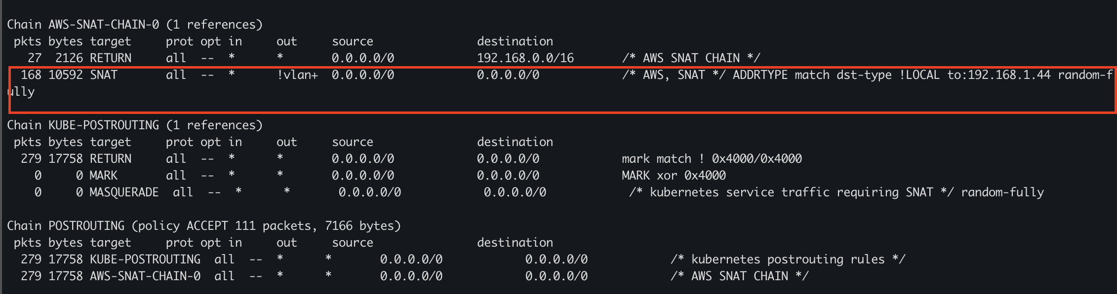 watch -d 'sudo iptables -v --numeric --table nat --list AWS-SNAT-CHAIN-0; echo ; sudo iptables -v --numeric --table nat --list KUBE-POSTROUTING; echo ; sudo iptables -v --numeric --table nat --list POSTROUTING'