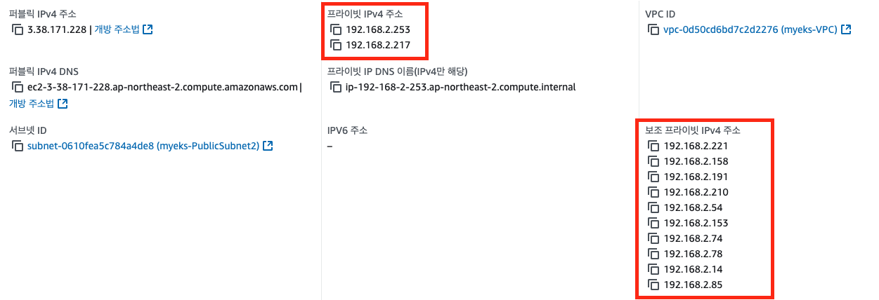 프라이머리 IP로 2개가 있으며, 보조 IP로 10개가 존재하는 것을 확인할 수 있다.
