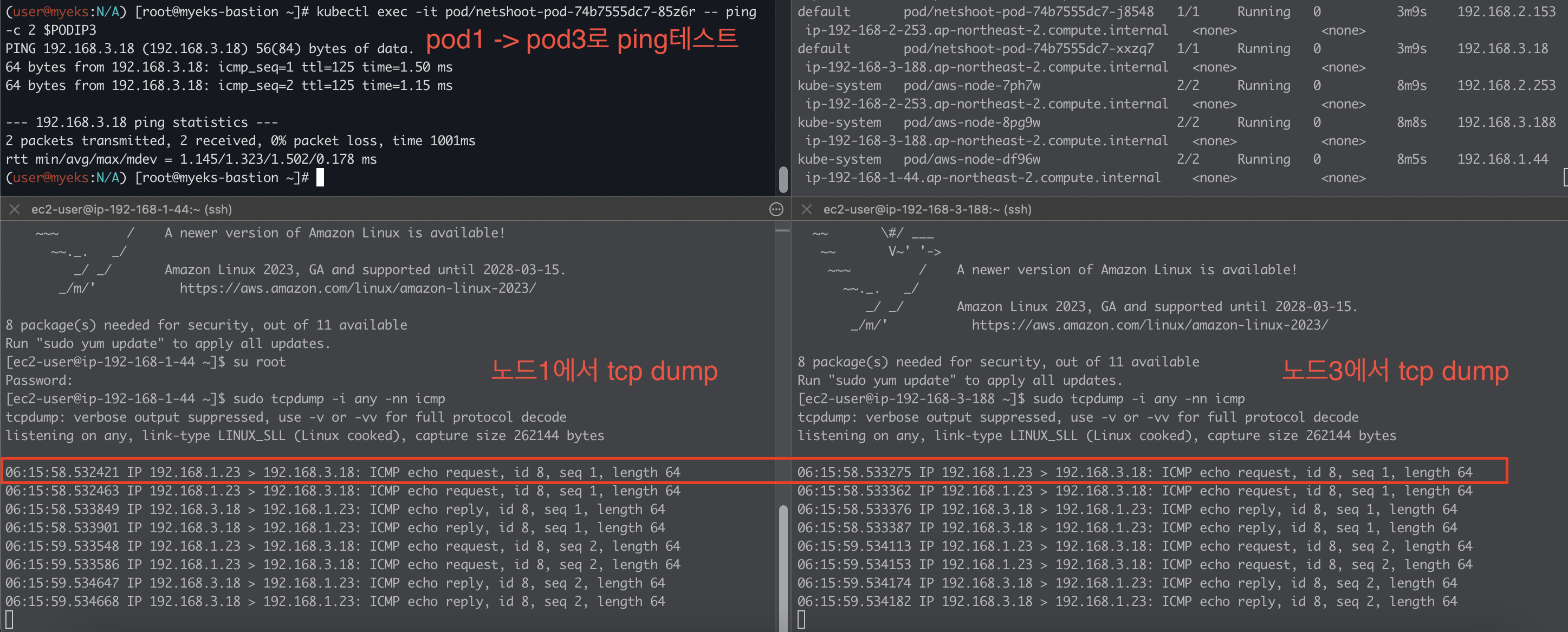 실제로 노드 1과 노드3에서 tcpdump를 확인해보면 pod1의 ip에서 pod3의 ip로 간다는 것을 확인할 수 있었다.