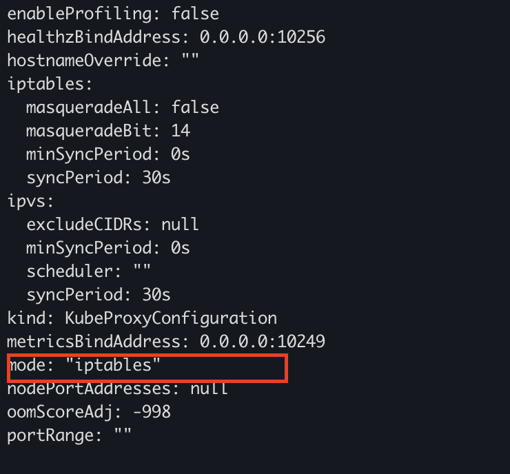 다음 명령어로 kube-proxy의 configMap을 확인하면 어떤 모드를 사용하는 지 확인할 수 있다.