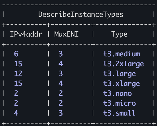 --query "InstanceTypes[].{Type: InstanceType, MaxENI: NetworkInfo.MaximumNetworkInterfaces, IPv4addr: NetworkInfo.Ipv4AddressesPerInterface}" \