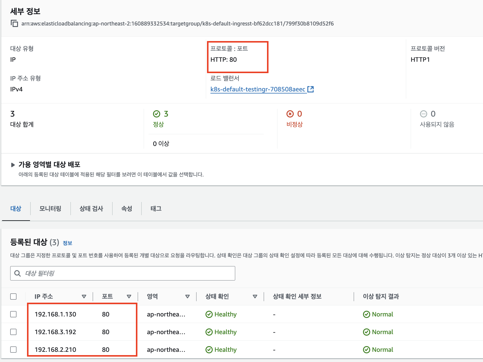 먼저 타겟 그룹을 확인해보면 포트 정보에서 실제 pod로 IP와 port로 등록된 것을 확인할 수 있다.