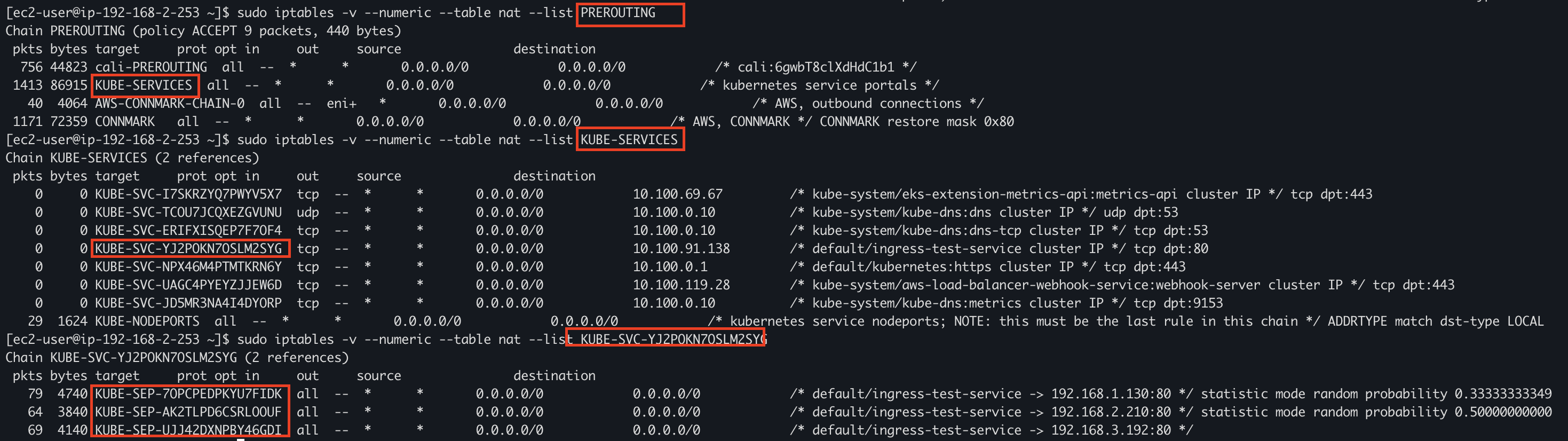 각 체인의 정책에 따라 트래픽이 흐르면서 pod로 접근하게 된다. 먼저 외부에서 호출하게되면 iptables의 PREROUTING 체인의 정책으로 시작한다.