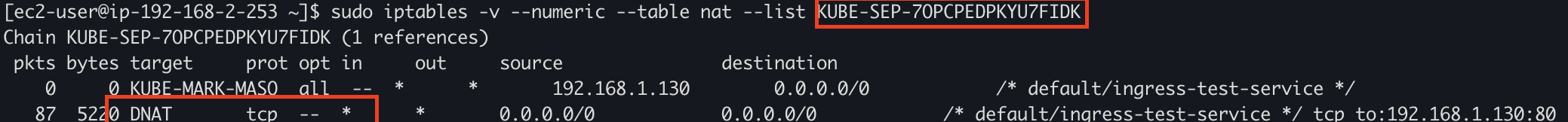 이는 실제 파드로 바로 트래픽이 전송되기 때문에 이렇게 설정된다. 이는 VPC CNI의 특성인데, pod가 노드와 동일한 VPC 내의 같은 CIDR에서 존재하기 때문에 별도의 NAT 과정이 필요없기 때문이다.