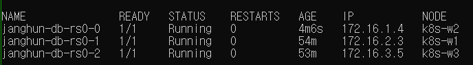현재 실습 중에는 Primary인 janghun-db-rs0-1이 속한 노드는 k8s-w1 노드이다.