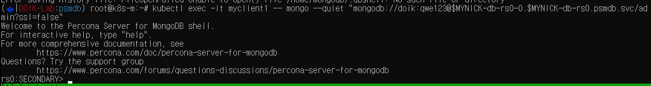 kubectl exec -it myclient1 -- mongo --quiet "mongodb://doik:qwe123@$MYNICK-db-rs0-0.$MYNICK-db-rs0.psmdb.svc/admin?ssl=false"