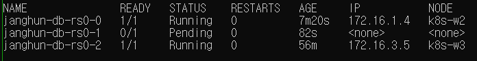 k8s-w1에 할당된 janghun-db-rs0-1은 현재 pending 상태로 유지되고 있다. 다시 db.isMaster를 조회해보면