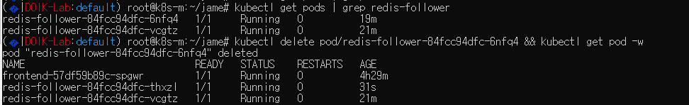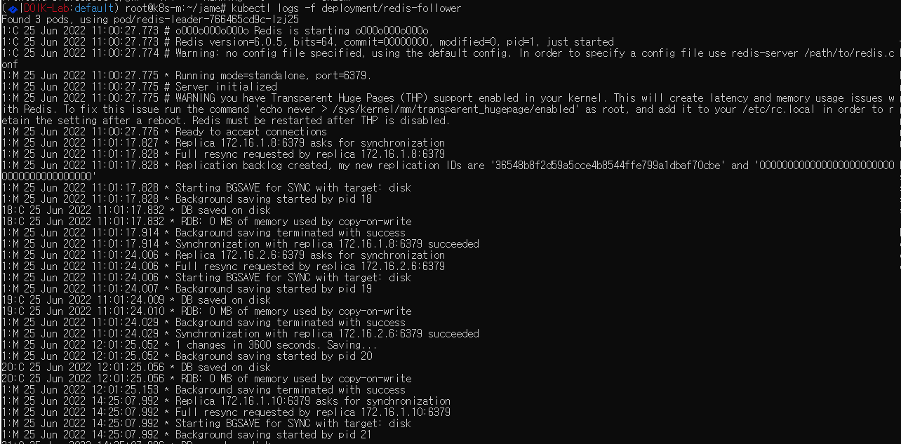 kubectl logs -f deploy/redis-follower 을 통해서 cluster log를 확인하고, 동기화 상태를 확인할 수 있다.