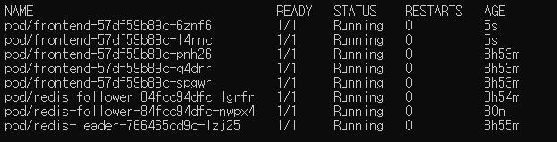해당 실습을 통해서 deploy 형태의 pod 배포, Redis의 Leader-Follower 구성, service를 통한 배포, frontend web과 연결, 파드 스케일 증가를 확인할 수 있다.